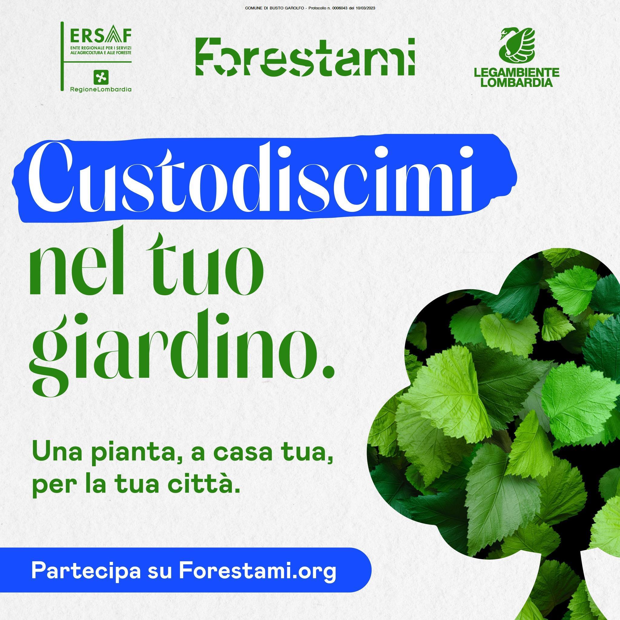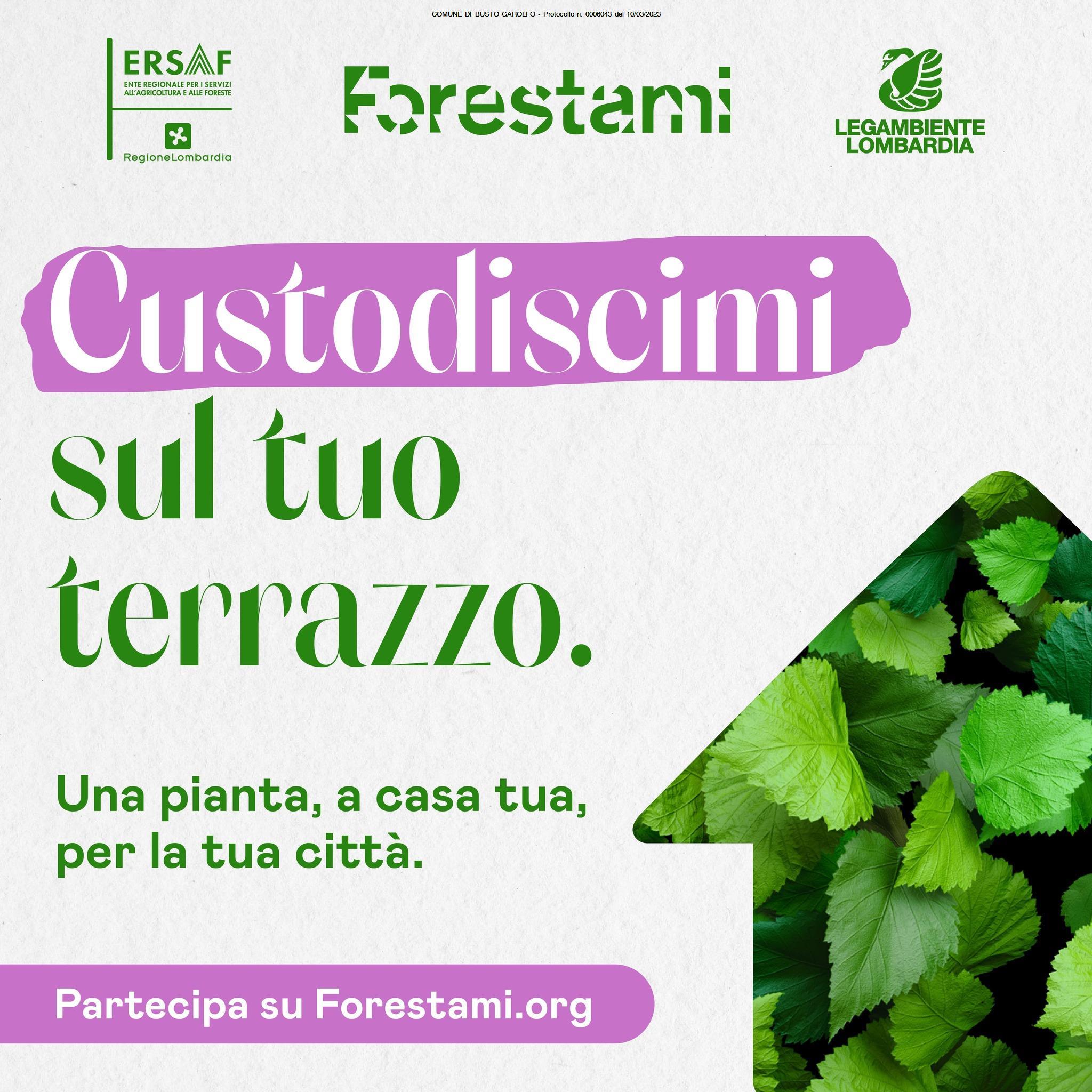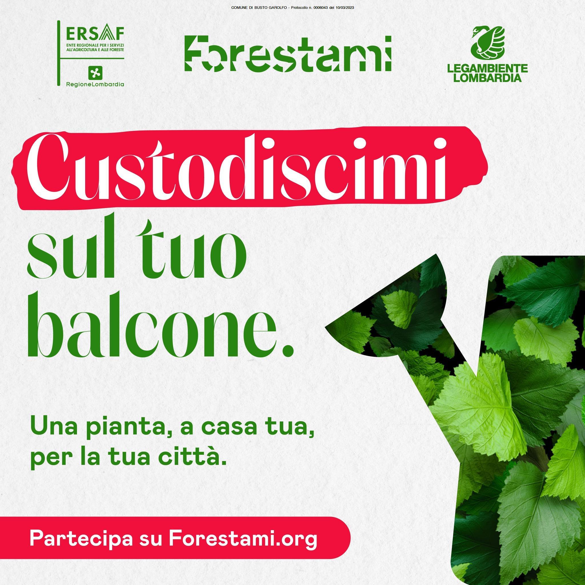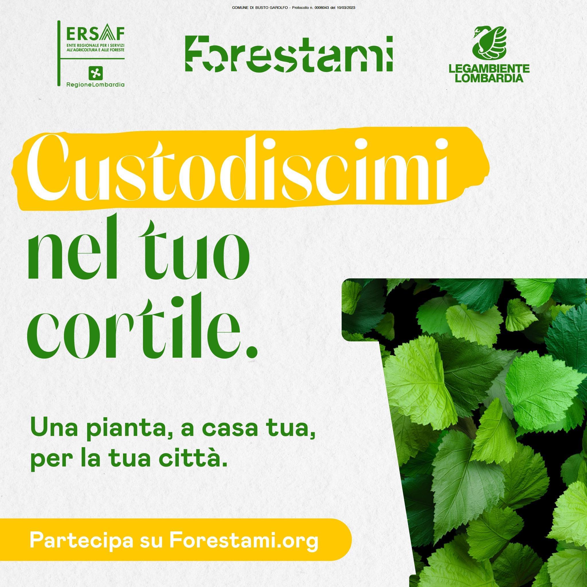 FORESTAMI è il progetto di forestazione urbana che sta incrementando il capitale naturale della Città Metropolitana di Milano piantando 3 milioni di alberi entro il 2030, lancia la seconda edizione di Custodiscimi, l'iniziativa promossa da Forestami, ERSAF e Legambiente Lombardia che prevede l'affido temporaneo di una piantina ai cittadini della Città Metropolitana di Milano.