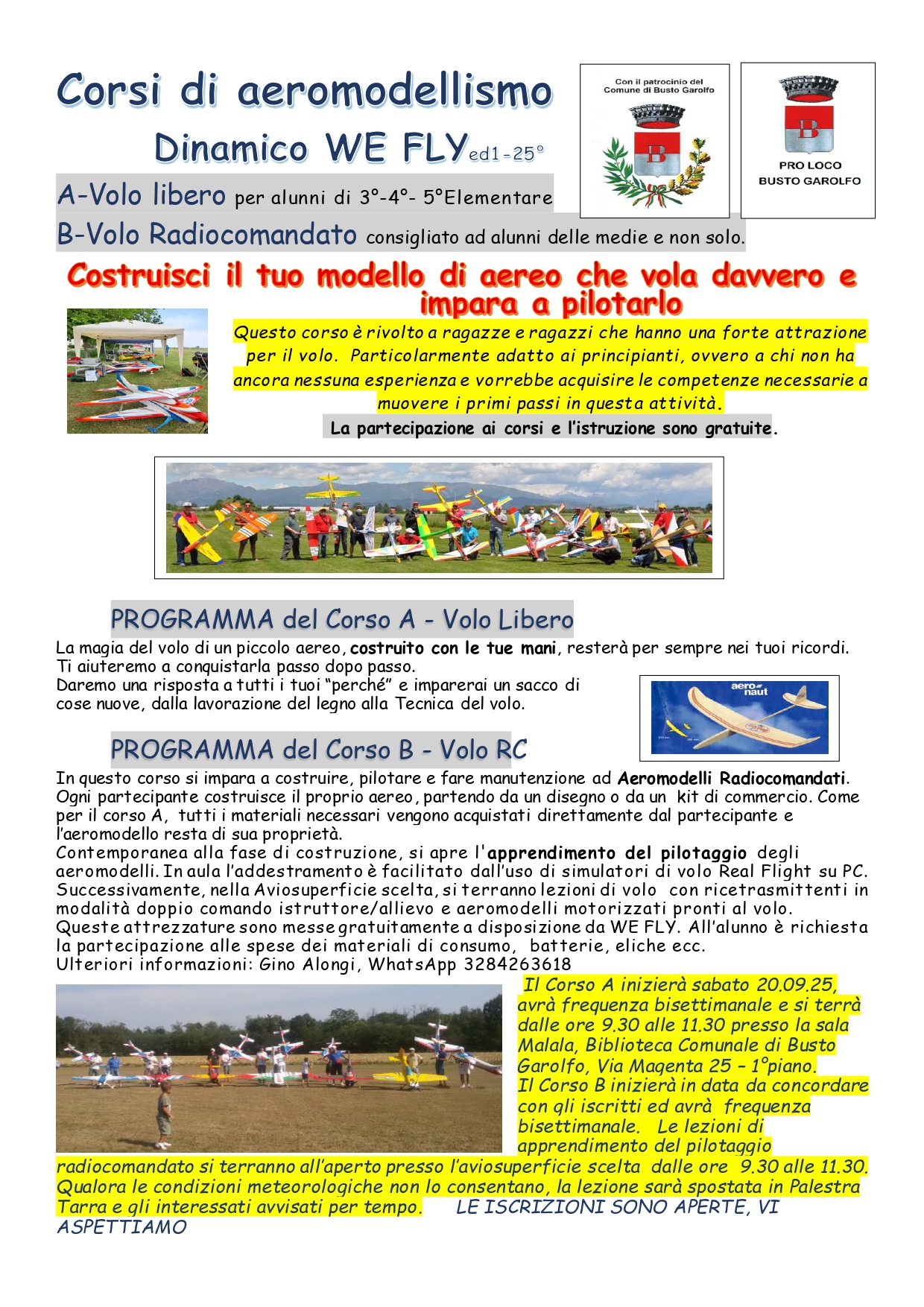 L'Associazione Pro Loco con il patrocinio del Comune di Busto Garolfo organizza corsi di aeromodellismo dinamico e volo radiocomandato "Progetto We Fly".
