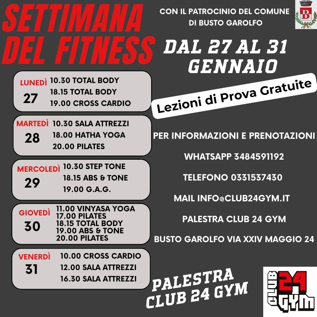 Il Club 24 Gym di Busto Garolfo con il patrocinio del Comune organizza la Settimana del Fitness dal 27 al 31 gennaio 2025 con lezioni di prova gratuite