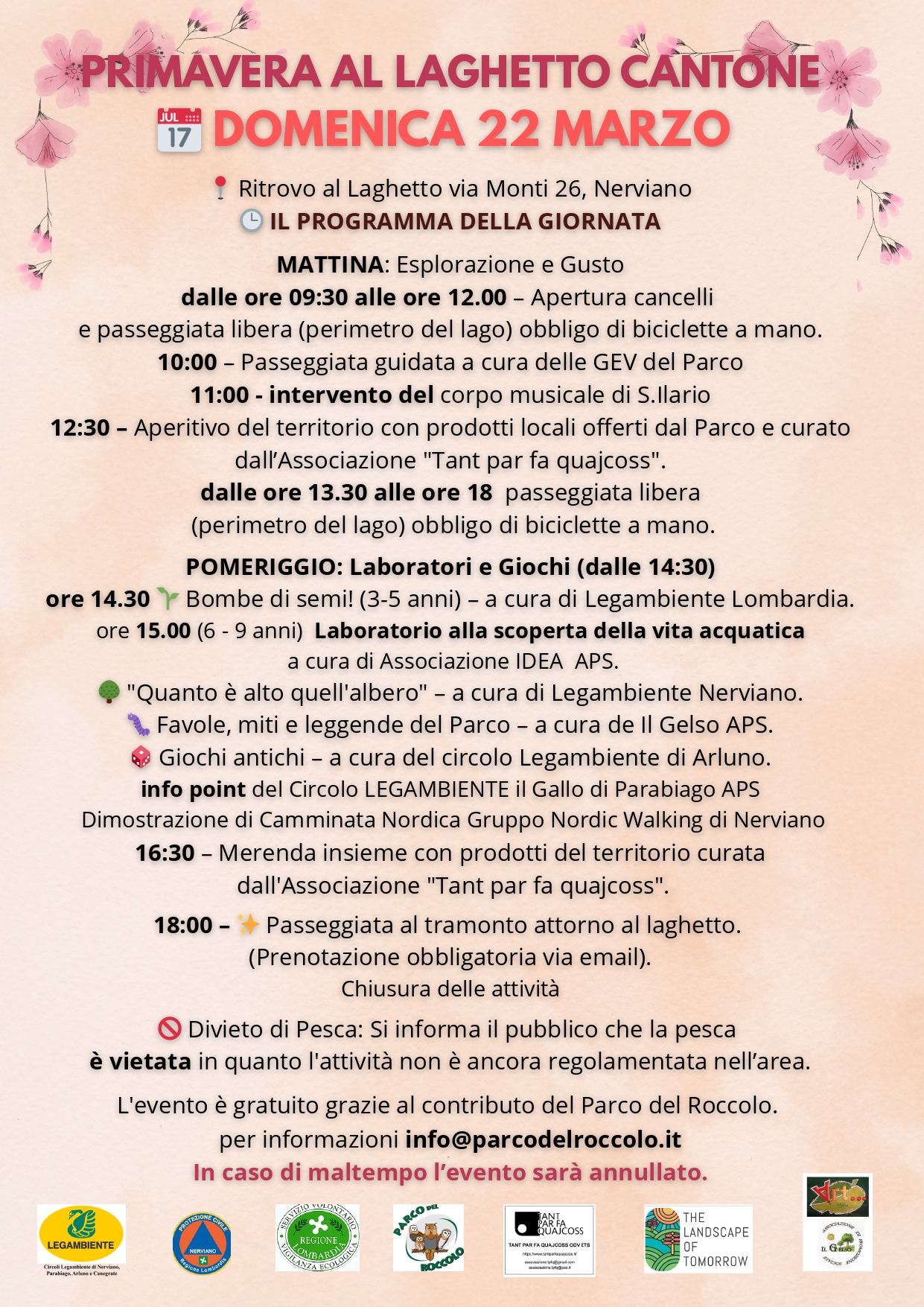 Domenica 22 marzo "Primavera al laghetto di Cantone" ritrovo al laghetto Via Monti 26, Nerviano dalle ore 9.30