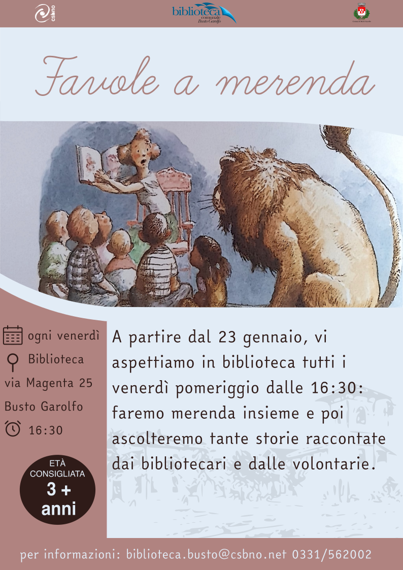 A partire dal 23 gennaio in biblioteca tutti i venerdì pomeriggio, dalle ore 16.30, aspettiamo bambine e bambini per fare merenda insieme e ascoltare tante storie, raccontate dai bibliotecari e dalle volontarie.