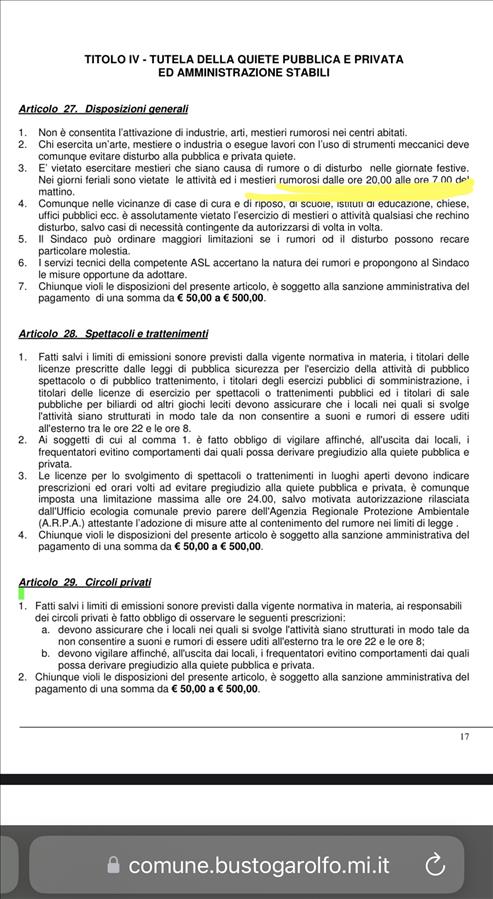 Per l’esecuzione dei lavori viene utilizzato per oltre un’ora un soffiatore per foglie, il cui forte rumore rende impossibile il sonno a partire dalle ore 6. Secondo il regolamento comunale di polizia municipale (art. 27, comma 3 che qui allego), è vietato svolgere mestieri rumorosi dalle h 20 alle h 7 del mattino.