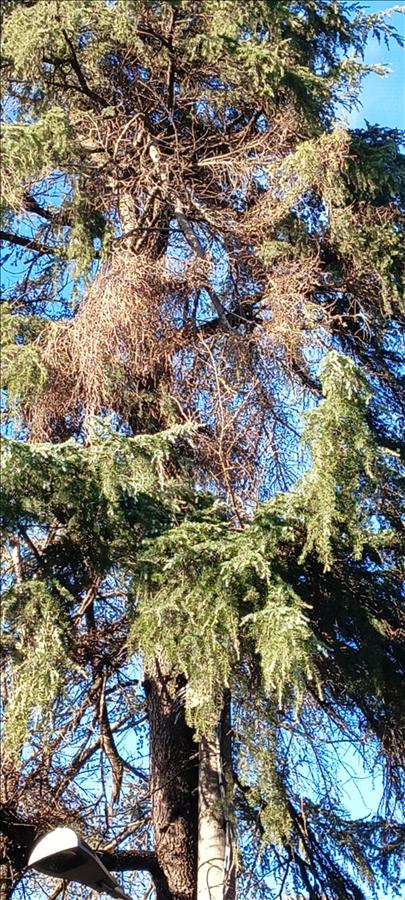 segnalo la presenza di due grossi tronchi, ormai staccati dall'albero di un grosso pino ( dopo gli ultimi eventi atmosferici del luglio scorso), in via Olcella n.6,