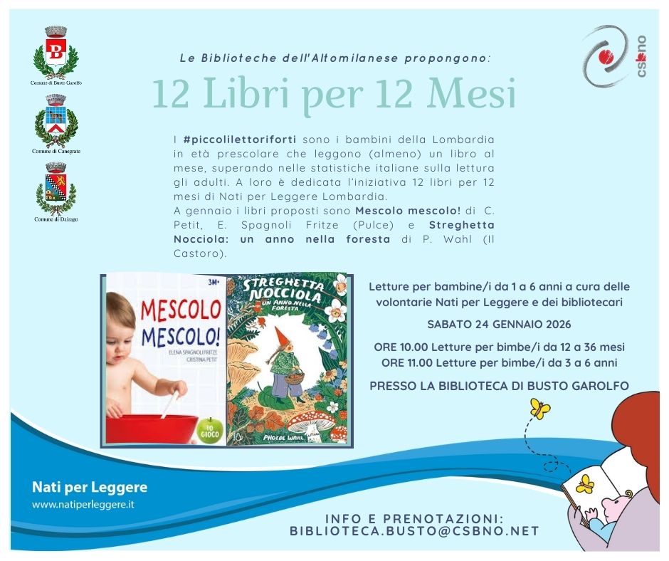 Le biblioteche dell'Altomilanese propongono 12 Libri per 12 Mesi, letture per bambine e bambini da 1 a 6 anni a cura delle volontarie Nati per Leggere e dei bibliotecari.