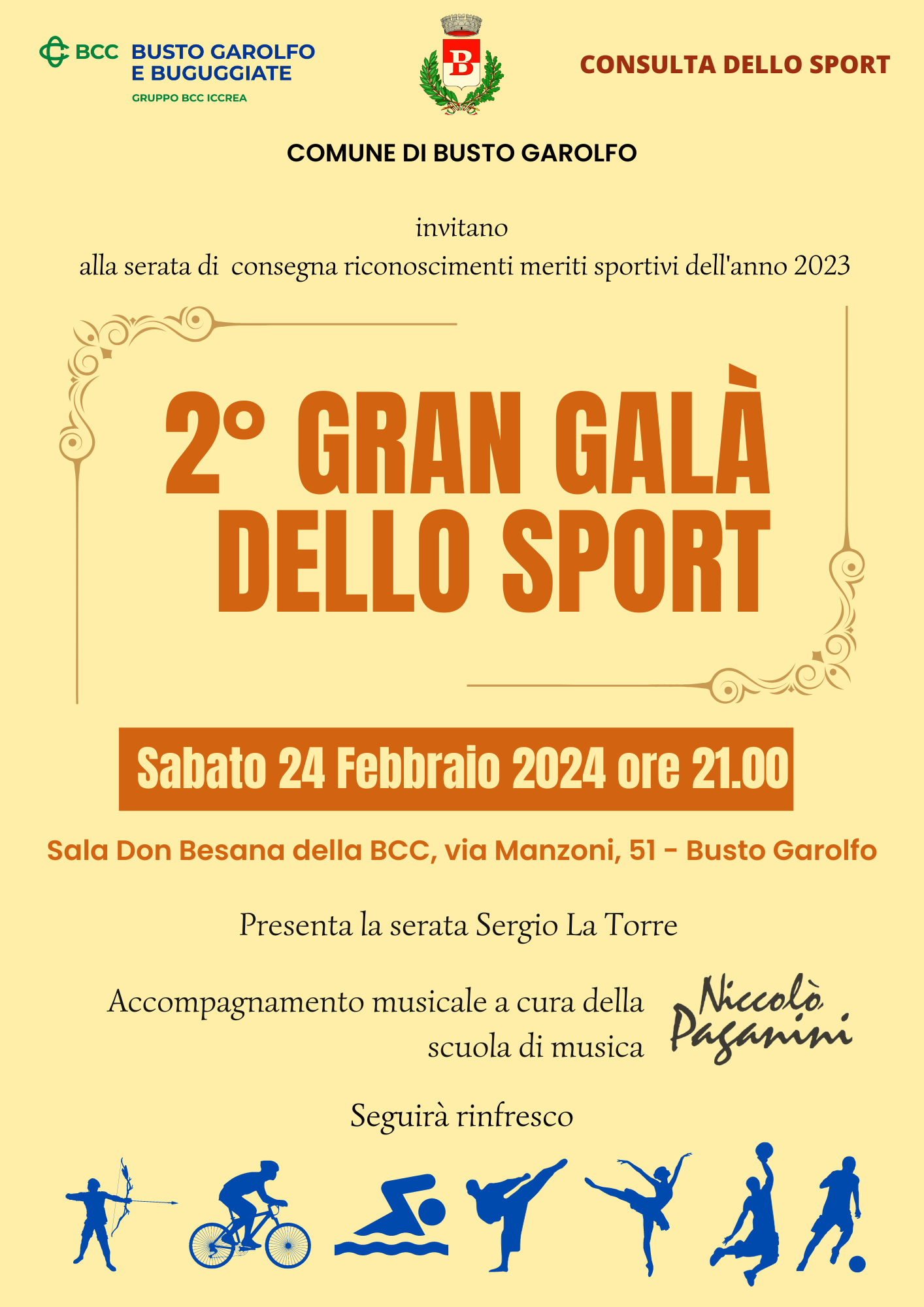 Serata di consegna riconoscimenti meriti sportivi dell'anno 2023, Sabato 24 Febbraio 2024 ore 21.00 Sala Don Besana della B.C.C. Allegato iil volantino