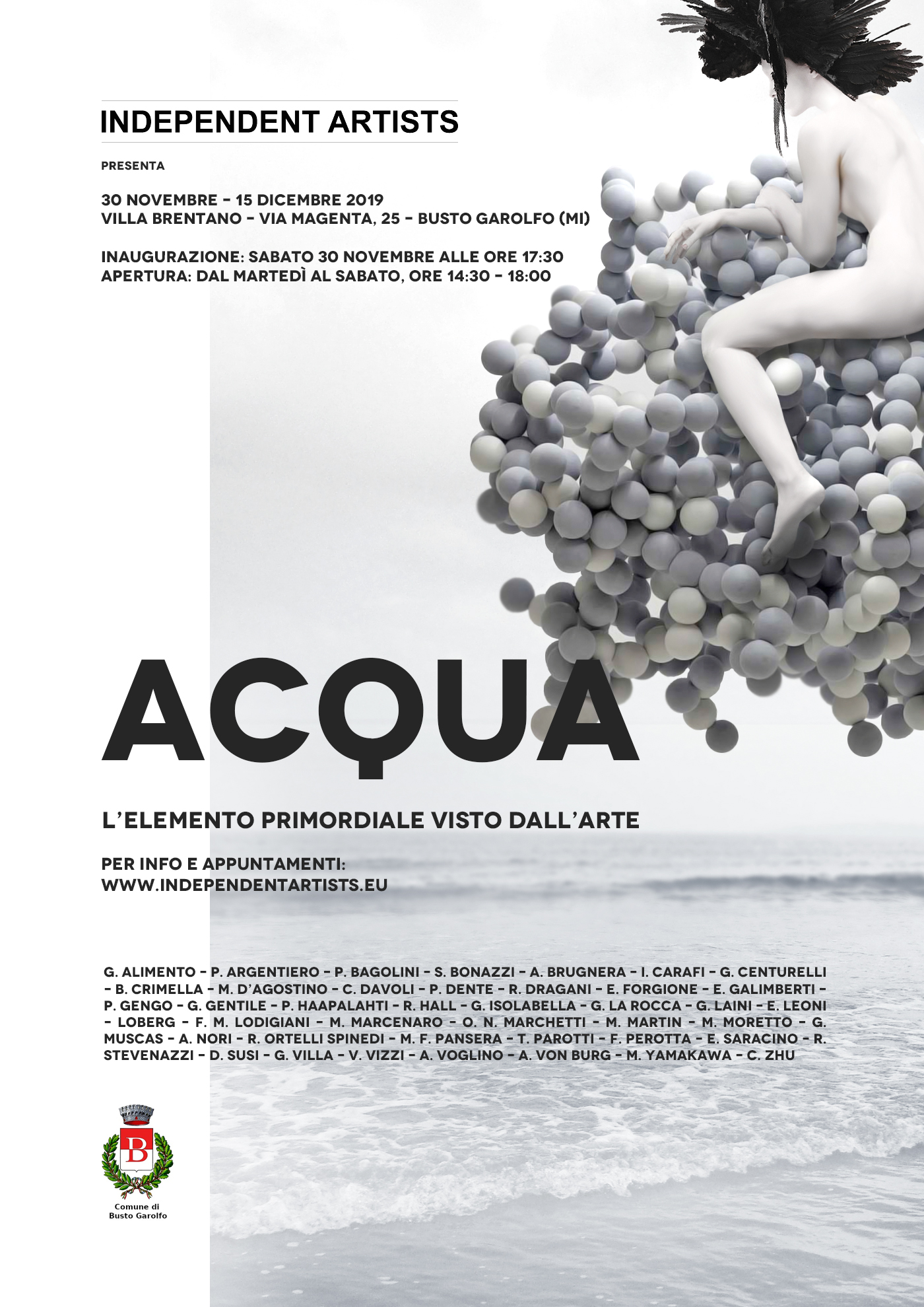 L'elemento primordiale visto dall'Arte. Inaugurazione della mostra: sabato 30 novembre ore 17:30 presso lo Spazio Espositivo di Villa Brentano, Via Magenta 25. Apertura : dal martedì al sabato, ore 14:30 - 18:00. Domenica 15 Dicembre: ore 14:30 - 18:00.