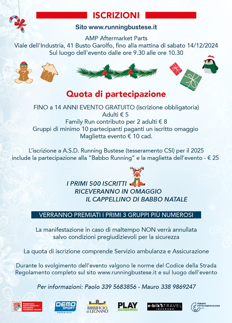 L'Associazione Running Bustese organizza l'evento ludico - motorio di 6 Km in Busto Garolfo e la family run di 3 Km, aperte a Nordic walking e camminatori, il 15 dicembre 2024