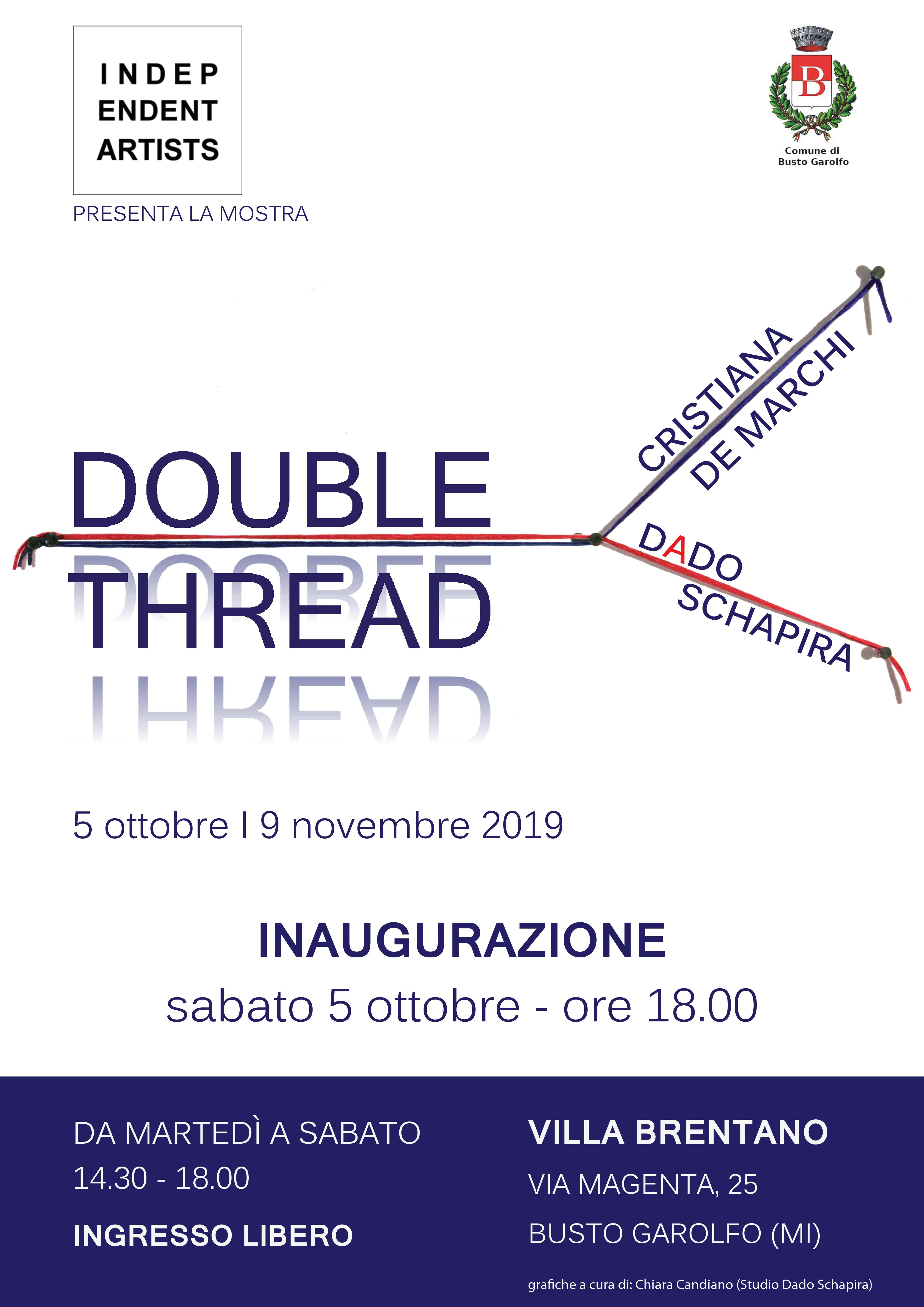 Esposizione di Cristiana De Marchi e Dado Schapira: il filo e il tessuto entrano nell'arte contemporanea. Spazio Espositivo di Villa Brentano, Via Magenta 25. Inaugurazione: sabato 5 ottobre 2019 ore 18:00. Orari di apertura: da martedì a sabato 14.30 - 18.00. Ingresso Libero.