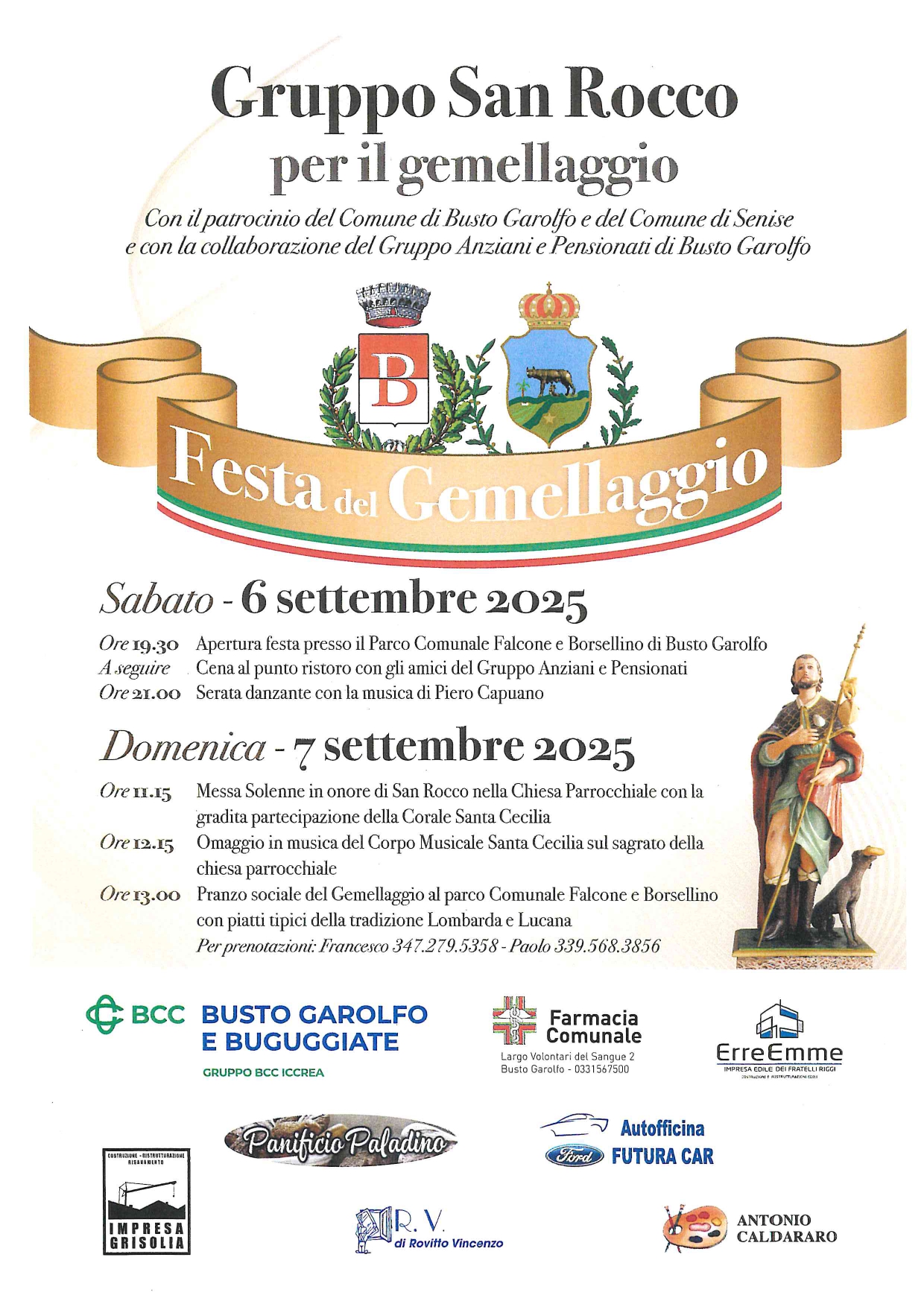 Il gruppo San Rocco per il gemellaggio con il patrocinio del Comune di Busto Garolfo e del Comune di Senise, in collaborazione con il Gruppo Anziani e Pensionati, organizza la Festa del Gemellaggio