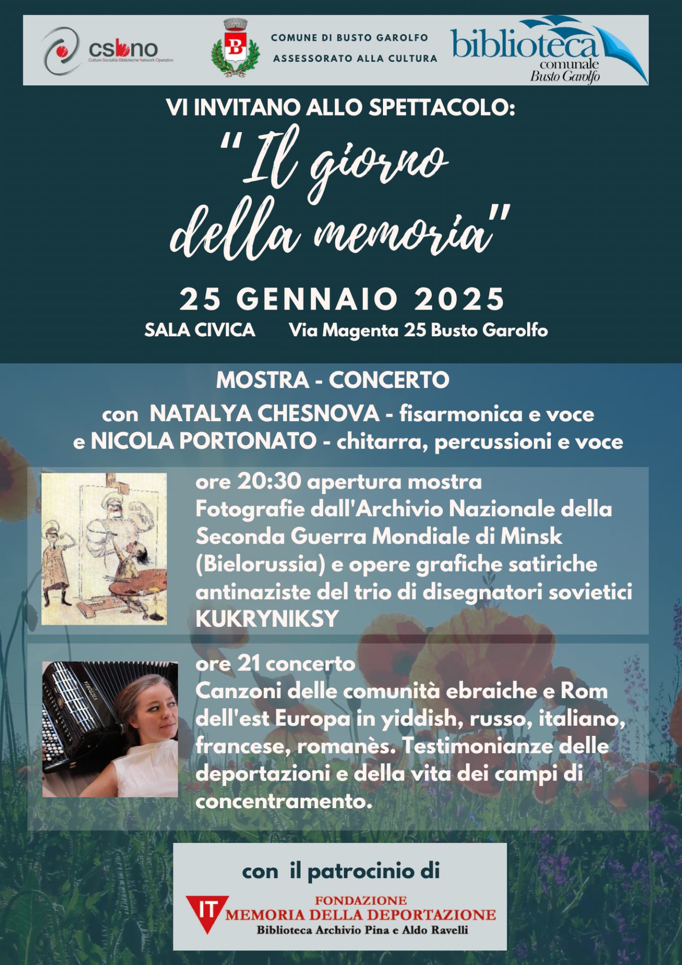 ore 21.00 Concerto delle comunità ebraiche e Rom dell'est Europa in yiddish, russo, italiano, francese, romanès. Testimonianze delle deportazioni e della vita dei campi di concentramento.