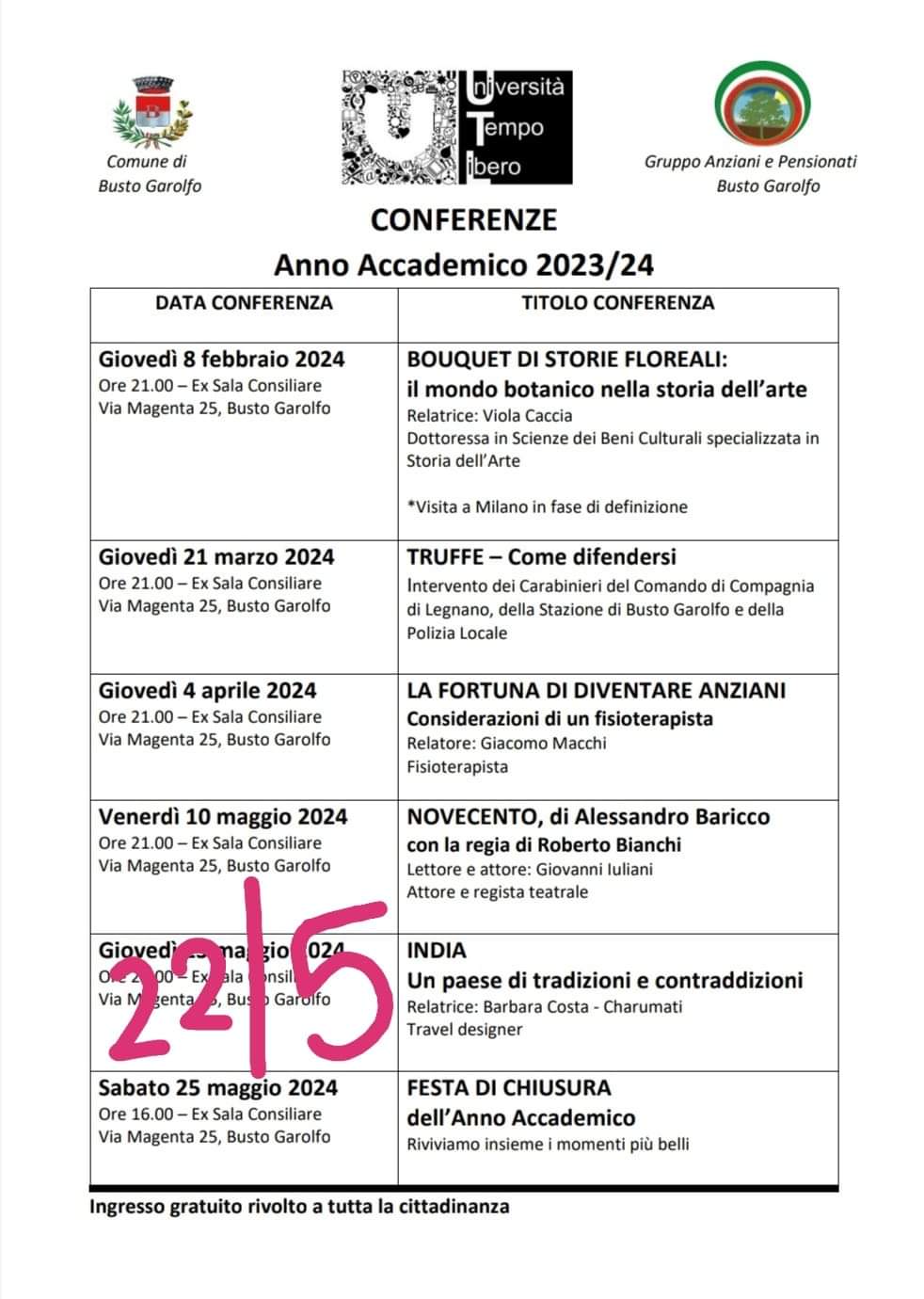 Nuova serata proposta all'interno del ciclo di conferenze gratuite ed aperte a tutta la cittadinanza, organizzato dall'Università del Tempo Libero, dal Gruppo Anziani e Pensionati e dal Comune di Busto Garolfo per l'anno accademico 2023/2024.