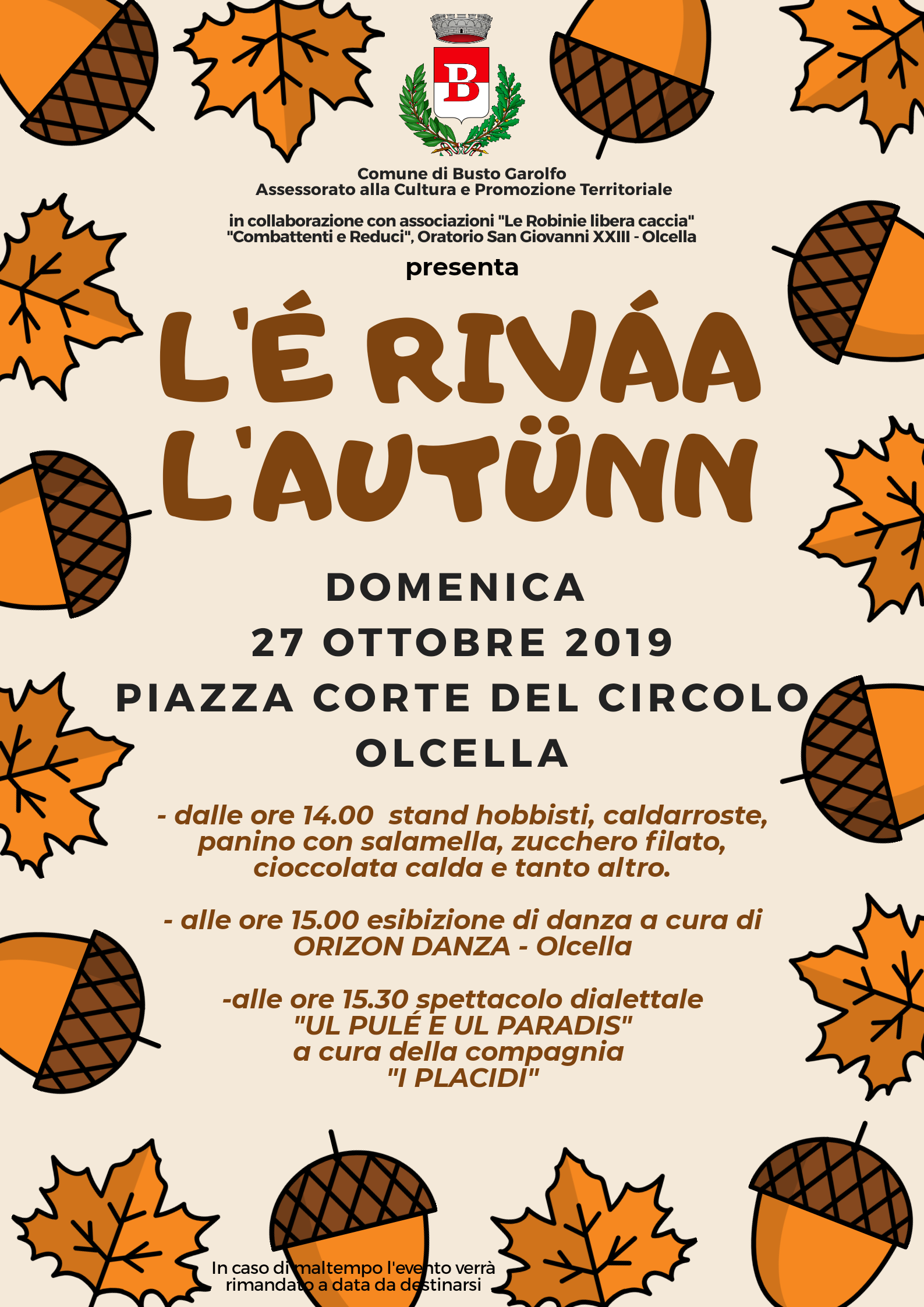Festa d'Autunno, con stand di hobbisti, esibizioni di danza, spettacolo teatrale e tante squisitezze da assaggiare. A partire dalle ore 14.00 in Piazza Corte del Circolo ad Olcella.