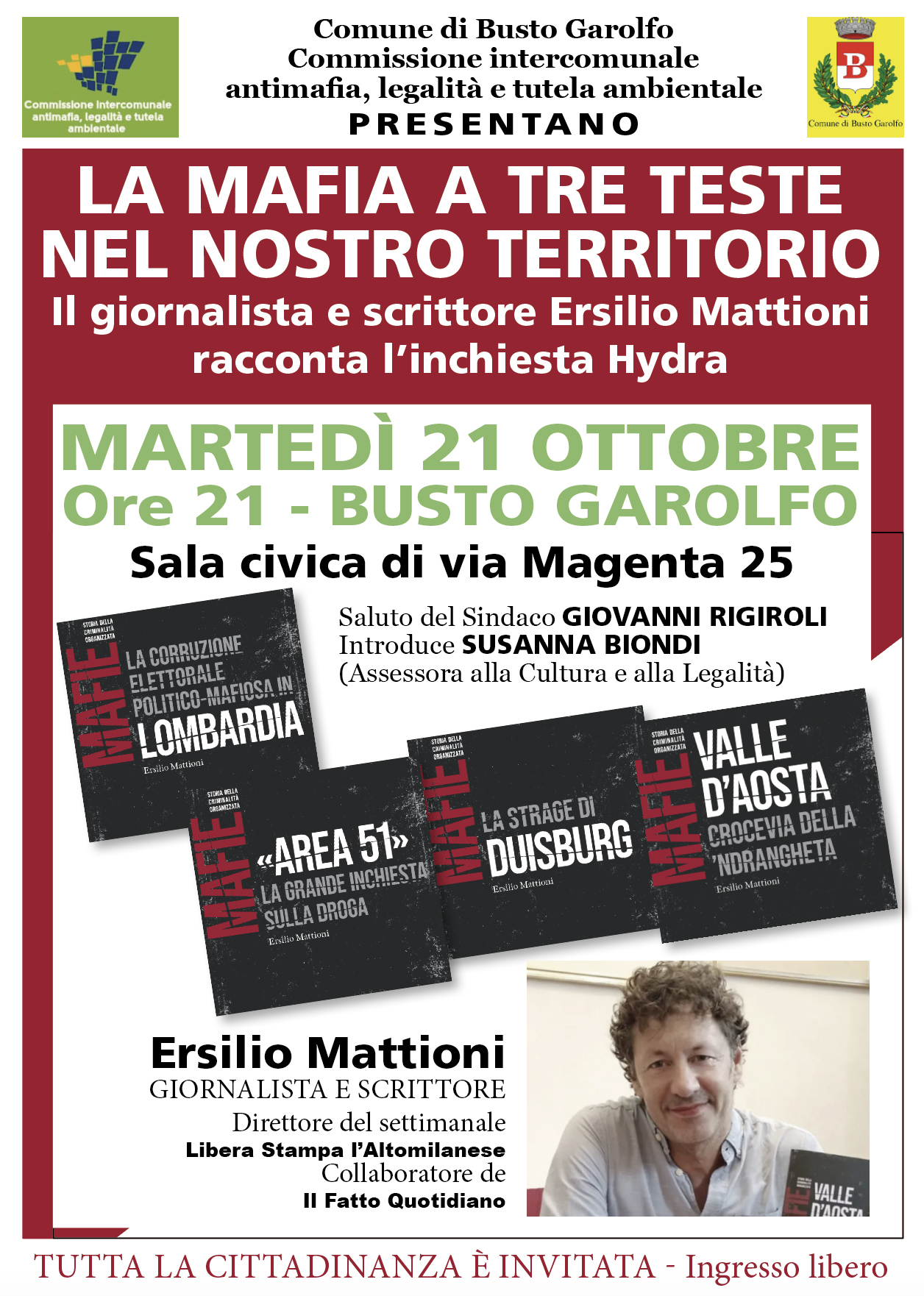Il Comune di Busto Garolfo e la Commissione intercomunale antimafia, legalità e tutela ambientale invitano ad un incontro pubblico sul tema "La mafia a tre teste nel nostro territorio" con il giornalista e scrittore Ersilio Mattioni. Saluto del Sindaco Giovanni Rigiroli e Introduzione dell'Assessora alla Cultura e alla Legalità Susanna Biondi.