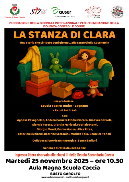 In occasione della Giornata Internazionale per l'eliminazione della violenza contro le donne viene rappresentato lo spettacolo teatrale "La stanza di Clara" realizzato dalla Scuola Teatro Junior di Legnano, con la regia di Jacopo Pari. Lo spettacolo racconta storie intrecciate in momenti di vita quotidiana, che si svolgono all’interno di un condominio in cui giovani inquilini sono legati, per diversi motivi, a Clara, una ragazza la cui esistenza e comportamenti prendono ispirazione dalla lettura del libro “Cara Giulia”, di Gino Cecchettin, in memoria della