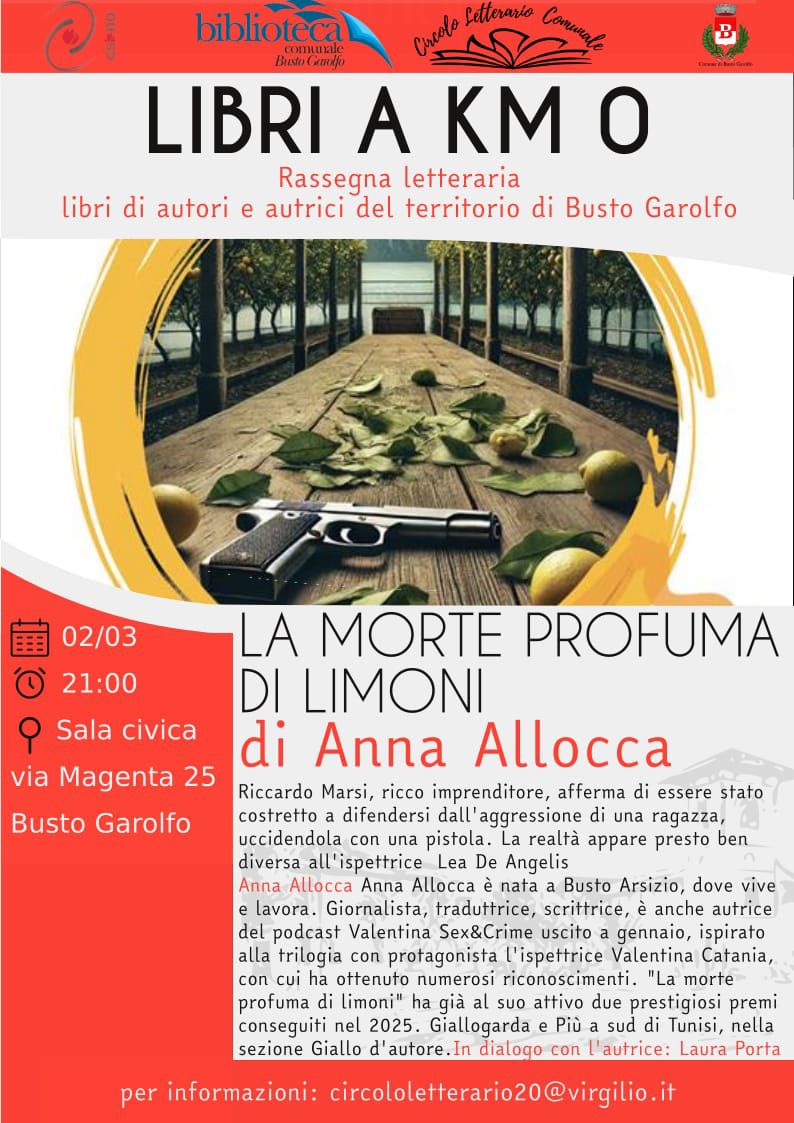 Si invita alla presentazione del libro "La morte profuma di limoni" di Anna Allocca, nell'ambito della rassegna letteraria che presenta libri di autori e autrici del territorio di Busto Garolfo, organizzata dalla Biblioteca e dal Circolo Letterario Comunale.