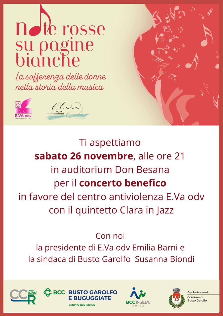 La sofferenza delle donne nella storia della musica. Concerto benefico in favore del Centro Antiviolenza E.Va odv con il quintetto Clara in Jazz, sabato 26 novembre alle ore 21.00 presso l'auditorium Don Besana, via Manzoni 51.