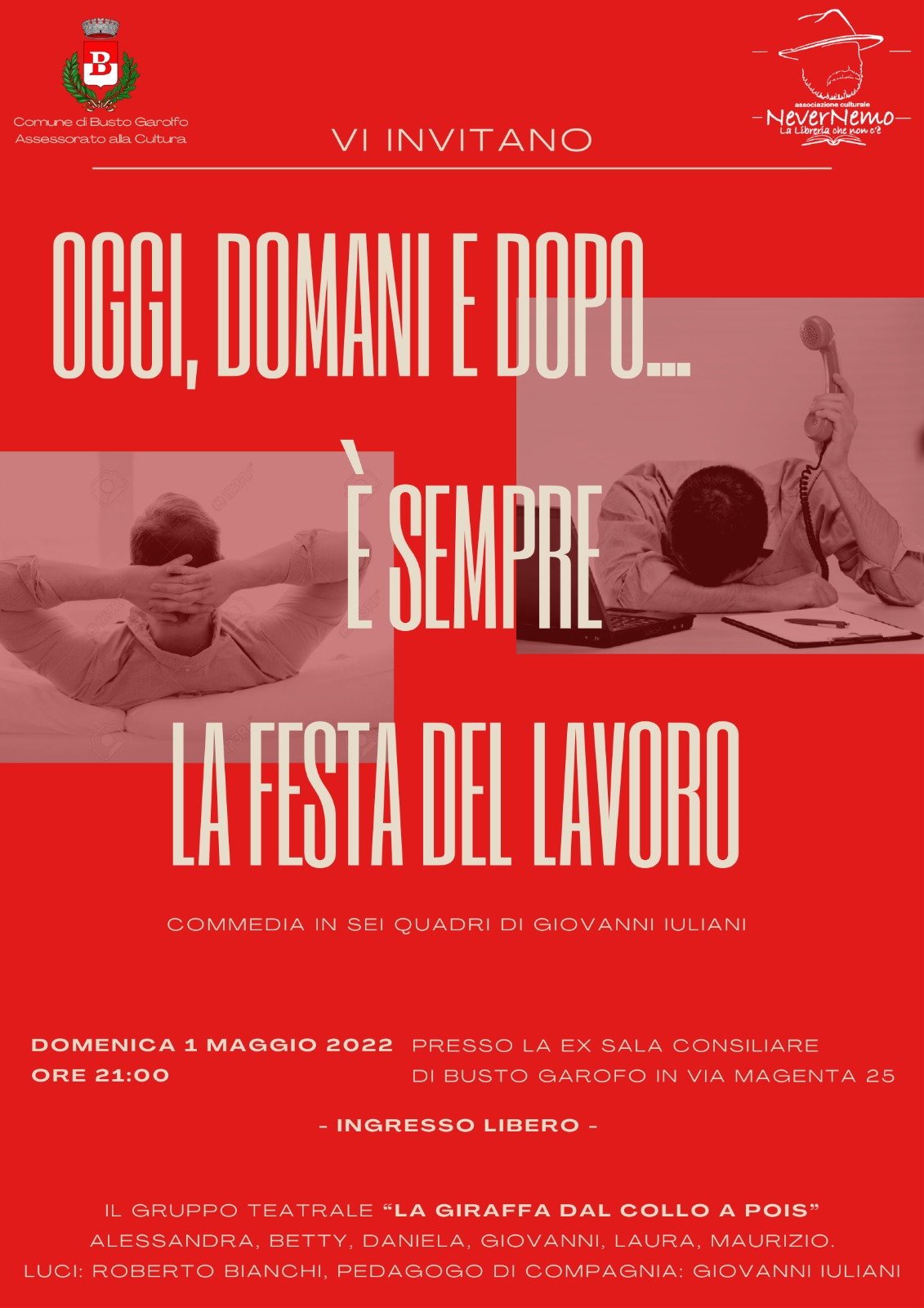 Il Comune di Busto Garolfo e l'Associazione Culturale Never Nemo La Libreria che non c'è di Busto Garolfo vi invitano alla rappresentazione: "Oggi domani e dopo ... E' sempre la Festa del Lavoro", commedia in sei quadri di Giovanni Iuliani, con il Gruppo Teatrale "La Giraffa dal collo a pois".