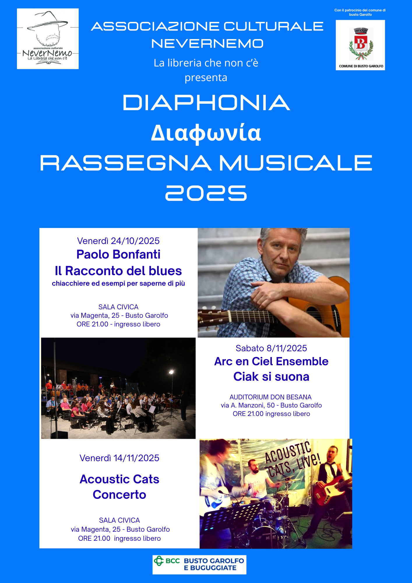L'Associazione culturale NeverNemo La Libreria che non c'è, con il patrocinio del Comune di Busto Garolfo, organizza la rassegna musicale Diaphonia.