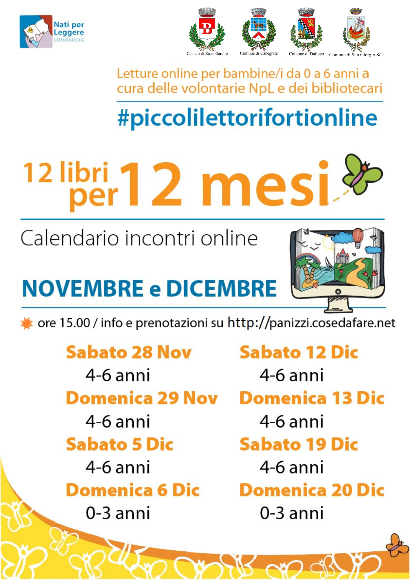 Nell'ambito del Programma Nazionale Nati per Leggere, gli incontri Piccoli Lettori Forti - letture per bambine/i da 0 a 6 anni - si svolgeranno on line, seguendo il calendario riportato nel volantino allegato. Info e prenotazioni su http://panizzi.cosedafare.net