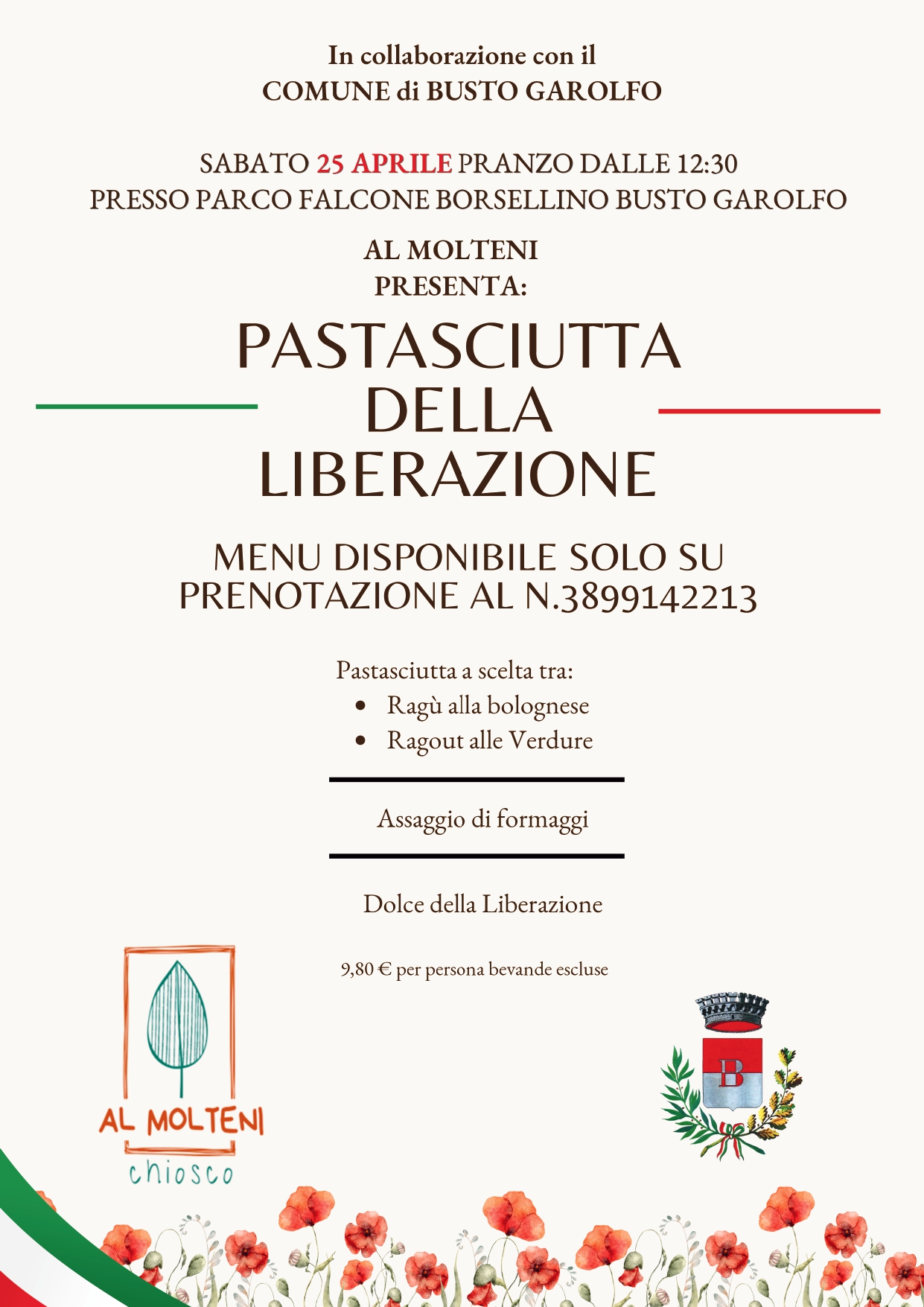 Per la festa del 25 aprile il chiosco Al Molteni, in collaborazione con il Comune di Busto Garolfo, organizza la "Pastasciutta della Liberazione" - parco comunale Falcone e Borsellino. La prenotazione è obbligatoria al n. 3899142213.