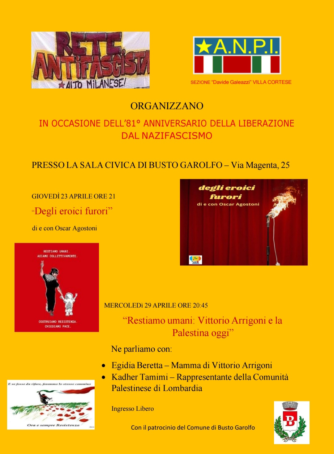A.N.P.I. Sezione " Davide Galeazzi" di Villa Cortese e Rete Antifascista Alto Milanese, con il patrocinio del Comune di Busto Garolfo, organizzano l'incontro sul tema: "Restiamo umani: Vittorio Arrigoni e la Palestina oggi".
