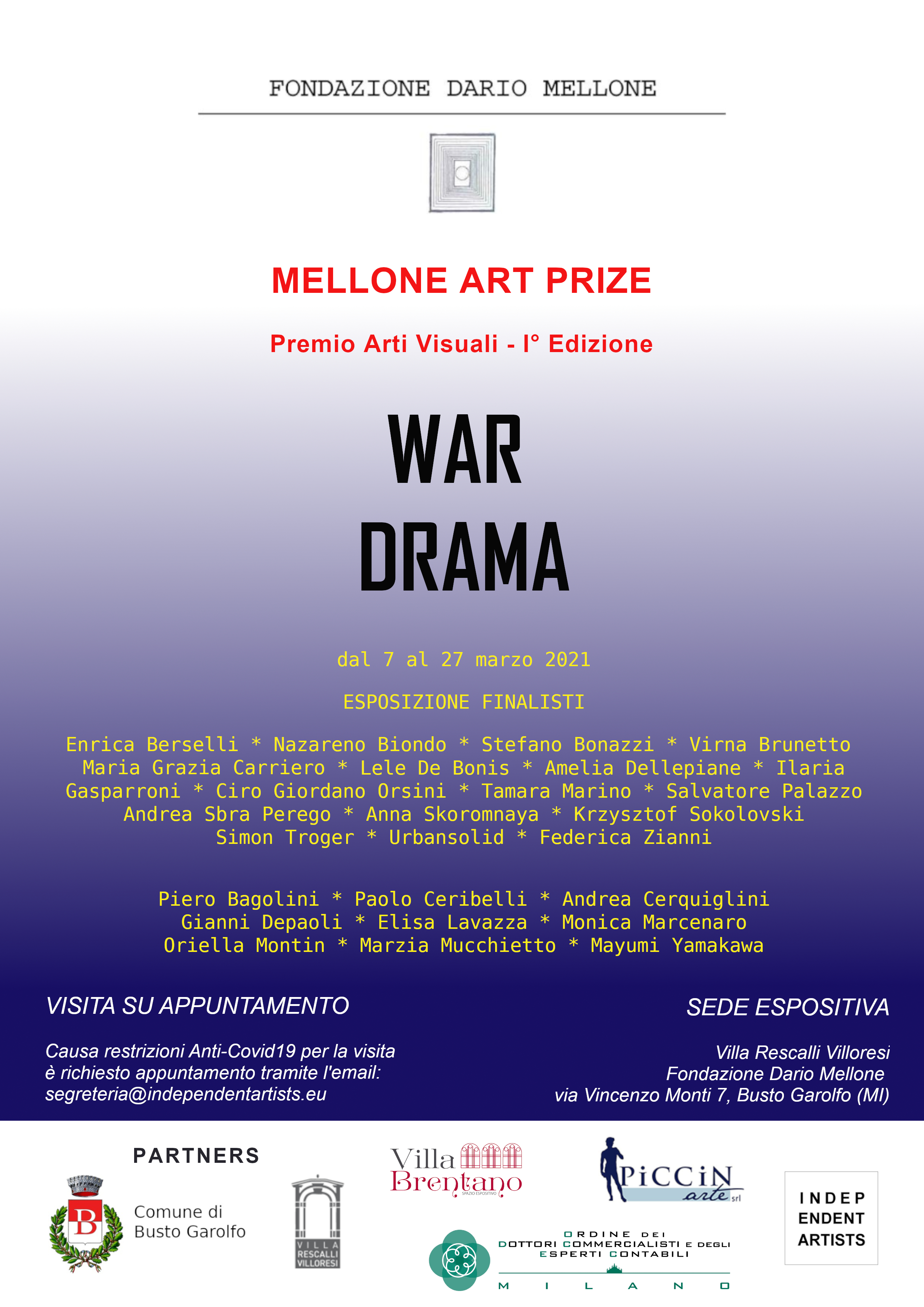 Nel contesto della 1' Edizione del Mellone Art Prize, le opere selezionate degli artisti finalisti sono messe in mostra nei locali espositivi della Fondazione Dario Mellone, presso Villa Rescalli Villoresi, con un allestimento tematico curato dal Comitato della Fondazione. La Giuria, visitata la mostra, emetterà il giudizio e la premiazione si svolgerà alla chiusura dell’evento, il 27 marzo, contestualmente alla presentazione del Catalogo. Dato il particolare periodo di restrizioni causa Covid-19, la mostra degli Artisti finalisti sarà visitabile esclusivamente su appuntamento con richiesta tramite email al seguente indirizzo: segreteria@independentartists.eu